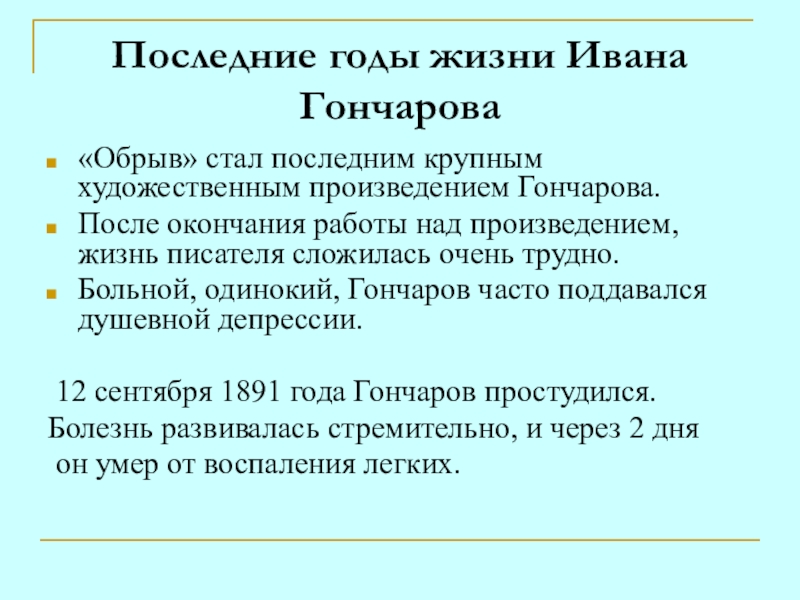 Последние годы жизни Ивана Гончарова «Обрыв» стал последним крупным художественным произведением Гончарова. После окончания работы над произведением,
