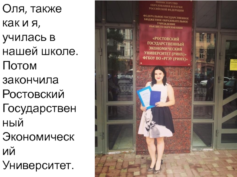 Слайд 3Оля, также как и я,училась в нашей школе.Потом закончила Ростовский