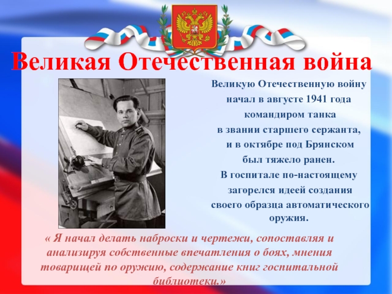 « Я начал делать наброски и чертежи, сопоставляя и анализируя собственные впечатления о боях, мнения товарищей по оружию, содержание книг госпитальной библиотеки.»