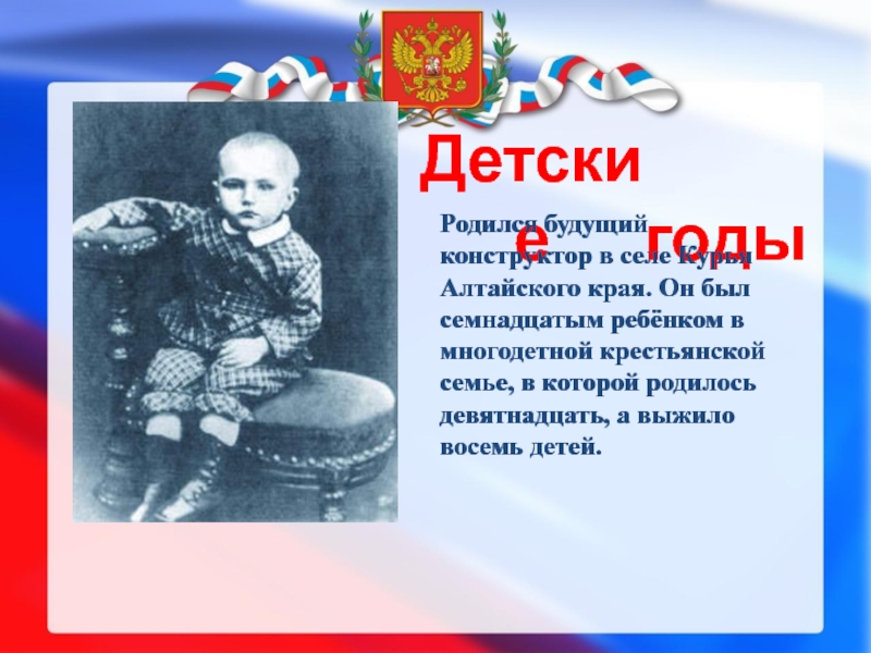 Родился будущий конструктор в селе Курья Алтайского края. Он был семнадцатым ребёнком в многодетной крестьянской семье, в которой родилось девятнадцать, а выжило восемь детей.