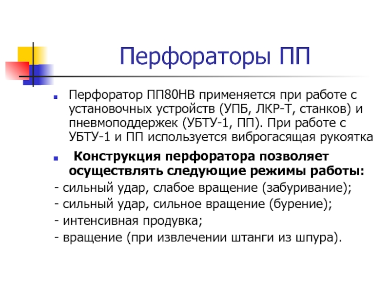 Станки производят бурение в породах средней крепости с помощью пневмоударника. В породах малой крепости станки могут осуществлять вращательное бурение скважин, для чего пневмоударник заменяется соответствующей коронкой. Кроме того, станки могут применяться для бурения дегазационных и дренажных скважин, а также других работ.