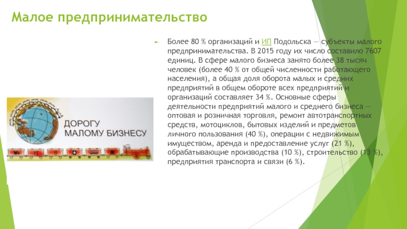 Более 80 % организаций и ИП Подольска — субъекты малого предпринимательства. В 2015