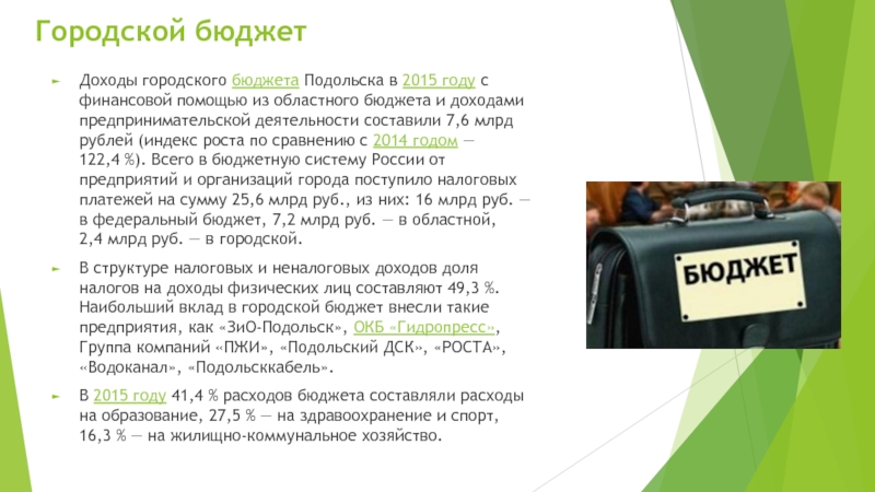 В структуре налоговых и неналоговых доходов доля налогов на доходы физических лиц составляют 49,3 %. Наибольший вклад в городской бюджет внесли такие предприятия, как «ЗиО-Подольск», ОКБ «Гидропресс», Группа компаний «ПЖИ», «Подольский ДСК», «РОСТА», «Водоканал», «Подольсккабель».