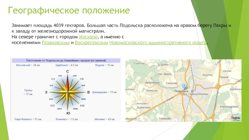 Занимает площадь 4039 гектаров. Большая часть Подольска расположена