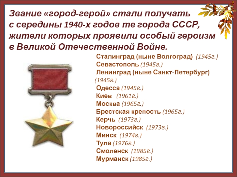 с середины 1940-х годов те города СССР, жители которых проявили особый героизм в Великой Отечественной Войне.