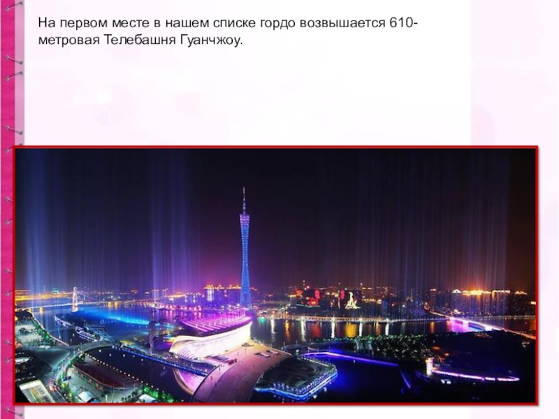 Слайд 51На первом месте в нашем списке гордо возвышается 610-метровая Телебашня Гуанчжоу.