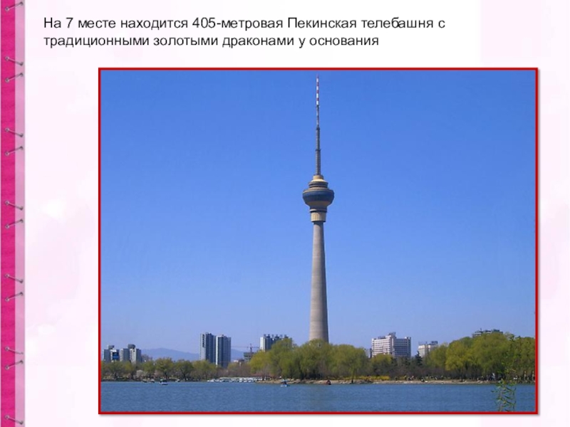 Слайд 44На 7 месте находится 405-метровая Пекинская телебашня с традиционными золотыми драконами у