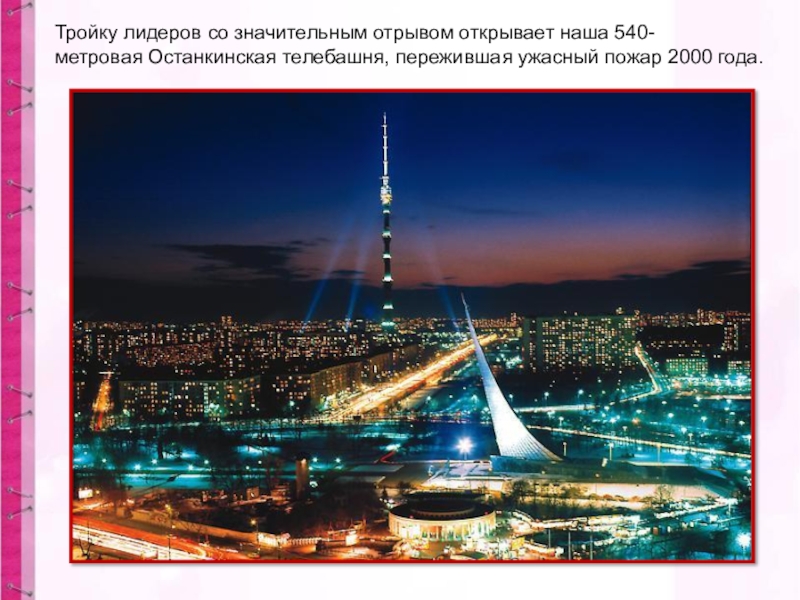 Слайд 48Тройку лидеров со значительным отрывом открывает наша 540-метровая Останкинская телебашня, пережившая