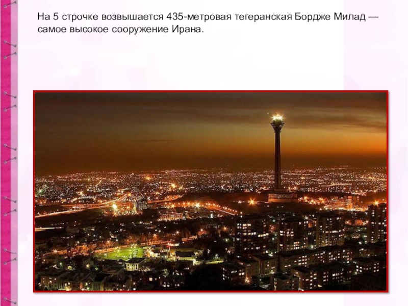 Слайд 46На 5 строчке возвышается 435-метровая тегеранская Бордже Милад — самое высокое сооружение