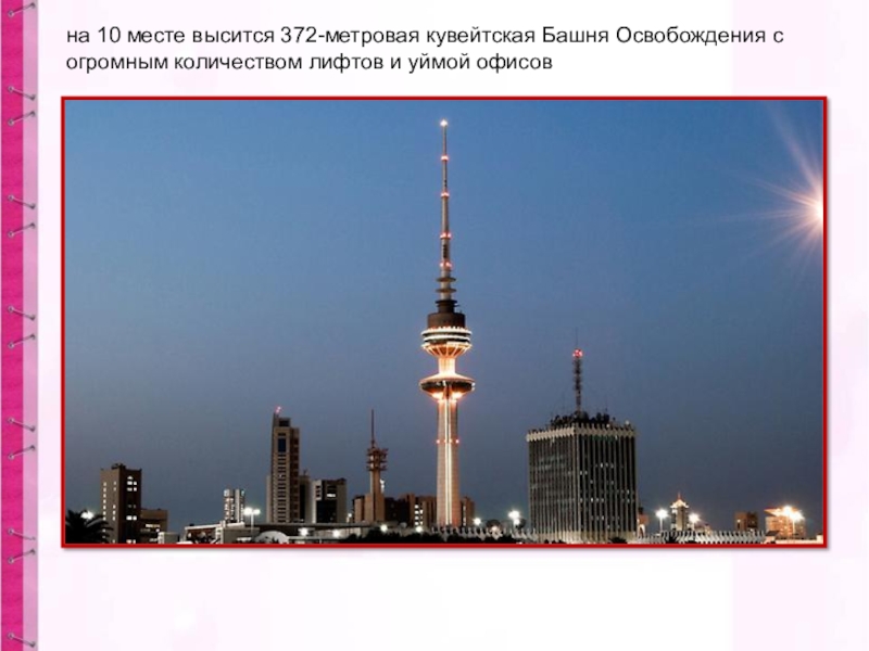 Слайд 41на 10 месте высится 372-метровая кувейтская Башня Освобождения с огромным количеством лифтов