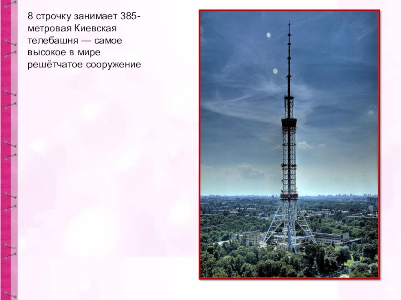 Слайд 438 строчку занимает 385-метровая Киевская телебашня — самое высокое в мире решётчатое
