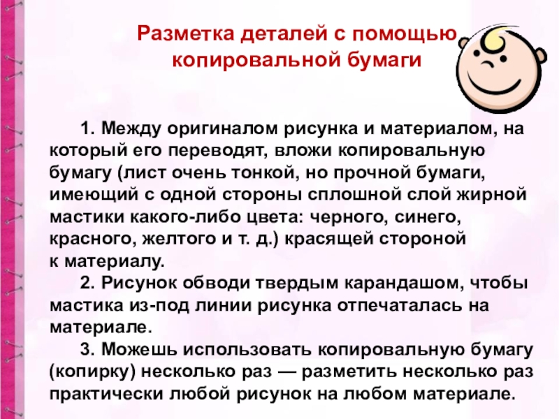3. Можешь использовать копировальную бумагу (копирку) несколько раз — разметить несколько раз практически любой рисунок на любом материале.