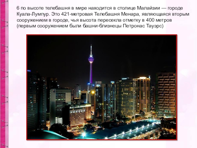 Слайд 456 по высоте телебашня в мире находится в столице Малайзии