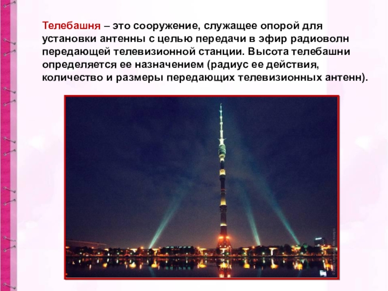 Слайд 14Телебашня – это сооружение, служащее опорой для установки антенны с
