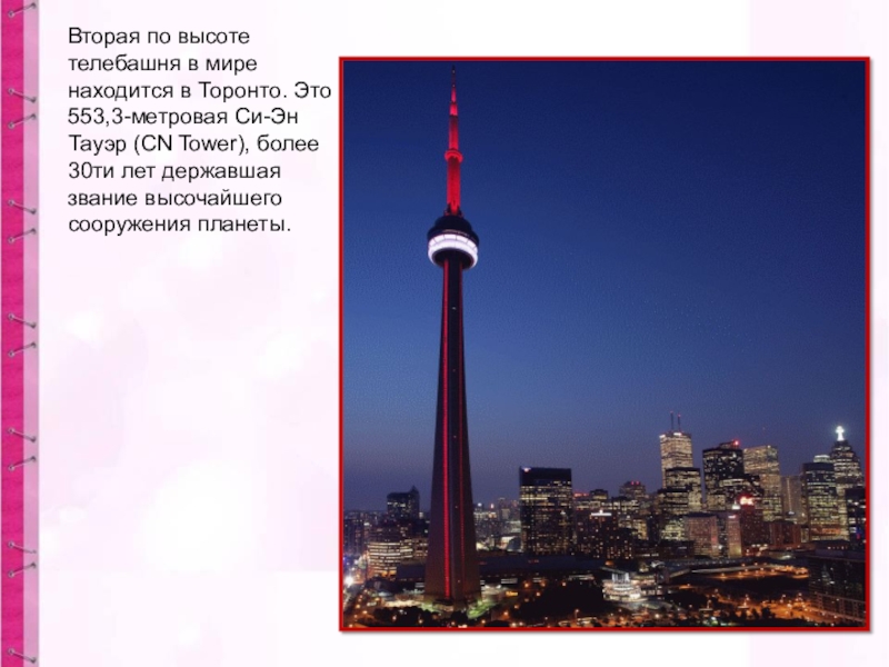 Слайд 50Вторая по высоте телебашня в мире находится в Торонто. Это