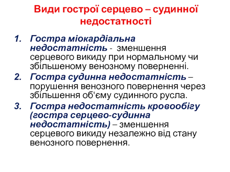 Гостра недостатність кровообігу (гостра серцево-судинна недостатність) – зменшення серцевого викиду незалежно від стану венозного повернення.