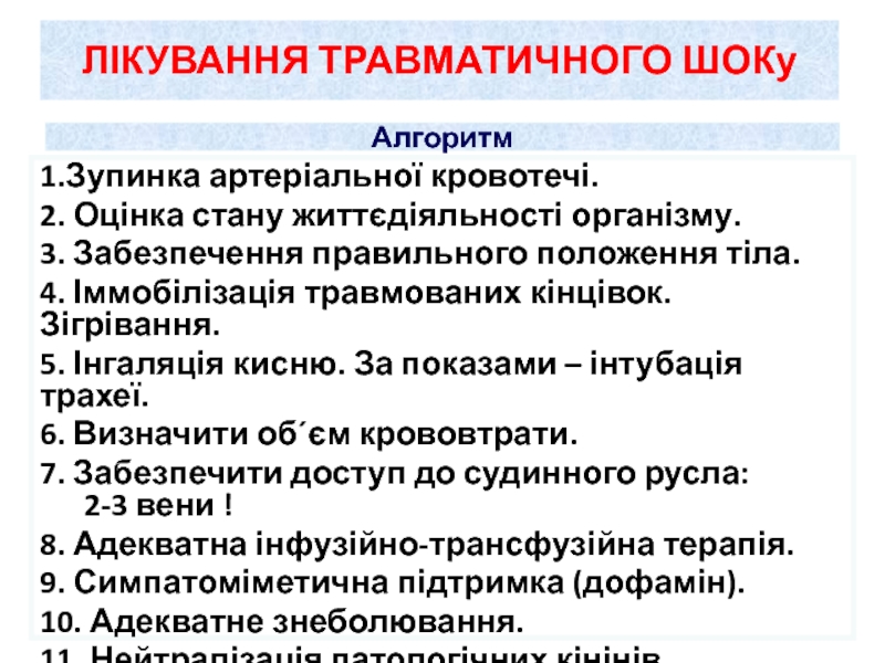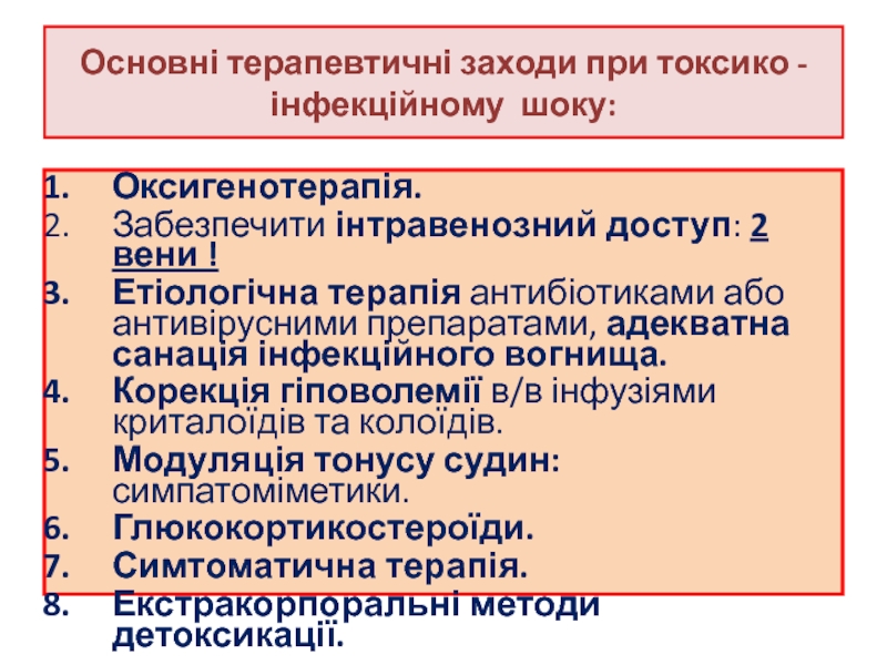 Слайд 71Основні терапевтичні заходи при токсико - інфекційному шоку:
