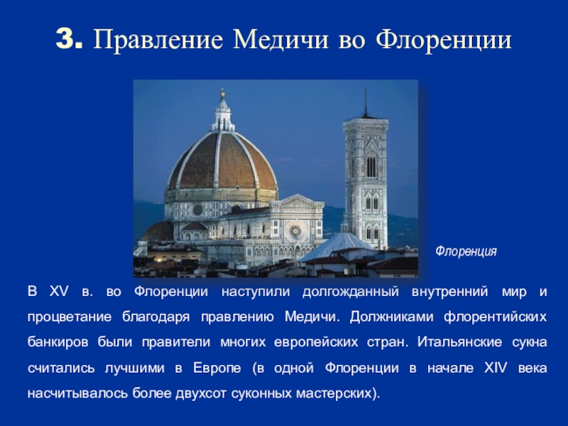 Флоренция – одно из самых развитых государств средневековой Италии, родина великих поэтов, писателей, живописцев, скульпторов, архитекторов.