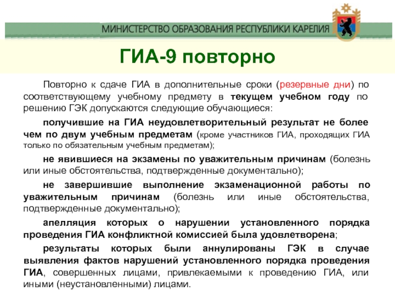 ГИА неудовлетворительные результаты более чем по одному обязательному учебному предмету, либо получившим повторно неудовлетворительный результат по одному из этих предметов на ГИА в резервные сроки, предоставляется право пройти ГИА по соответствующим учебным предметам не ранее 1 сентября текущего года