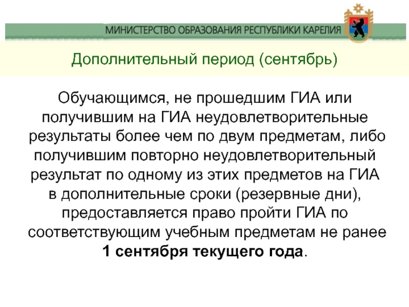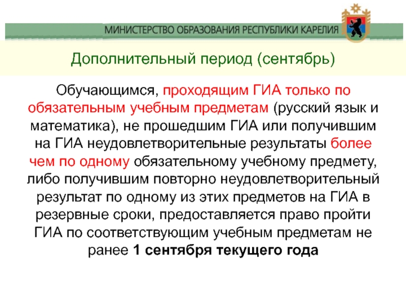 неудовлетворительный результат по одному из этих предметов на ГИА в дополнительные сроки (резервные дни), предоставляется право пройти ГИА по соответствующим учебным предметам не ранее 1 сентября текущего года.