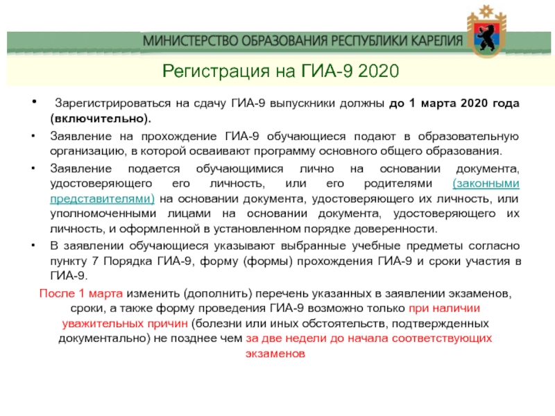 После 1 марта изменить (дополнить) перечень указанных в заявлении экзаменов, сроки, а также форму проведения ГИА-9 возможно только при наличии уважительных причин (болезни или иных обстоятельств, подтвержденных документально) не позднее чем за две недели до начала соответствующих экзаменов