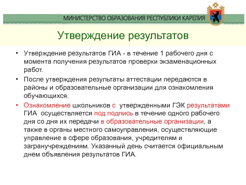 Утверждение результатов ГИА - в течение 1 рабочего дня