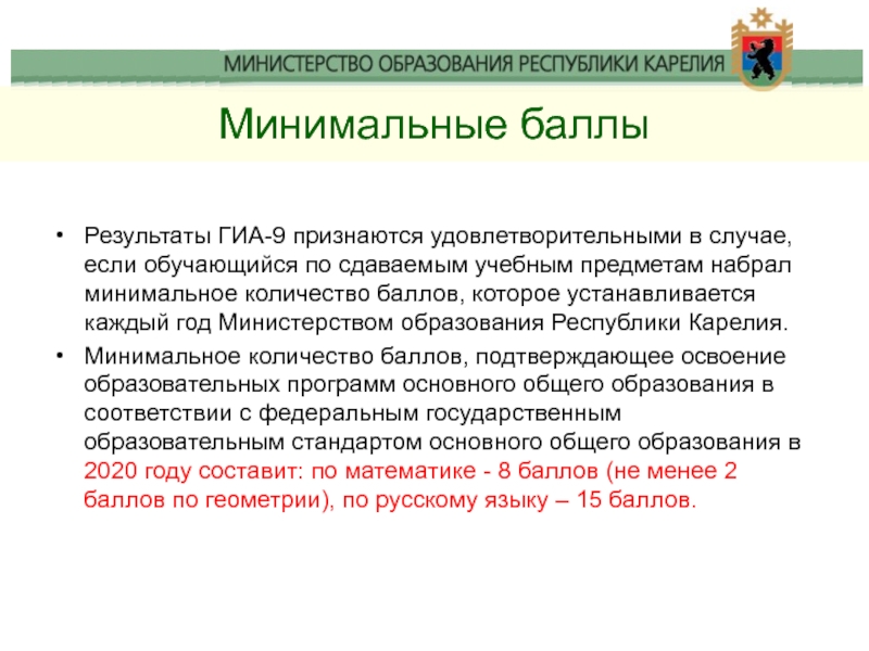 Минимальное количество баллов, подтверждающее освоение образовательных программ основного общего образования в соответствии с федеральным государственным образовательным стандартом основного общего образования в 2020 году составит: по математике - 8 баллов (не менее 2 баллов по геометрии), по русскому языку – 15 баллов.