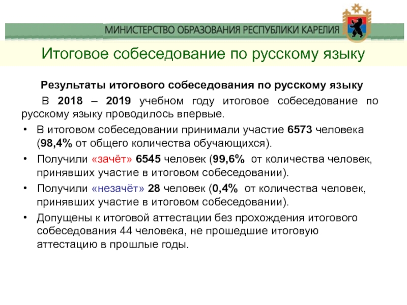 Получили «зачёт» 6545 человек (99,6% от количества человек, принявших участие в итоговом собеседовании).