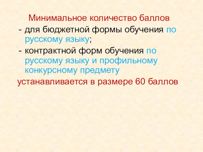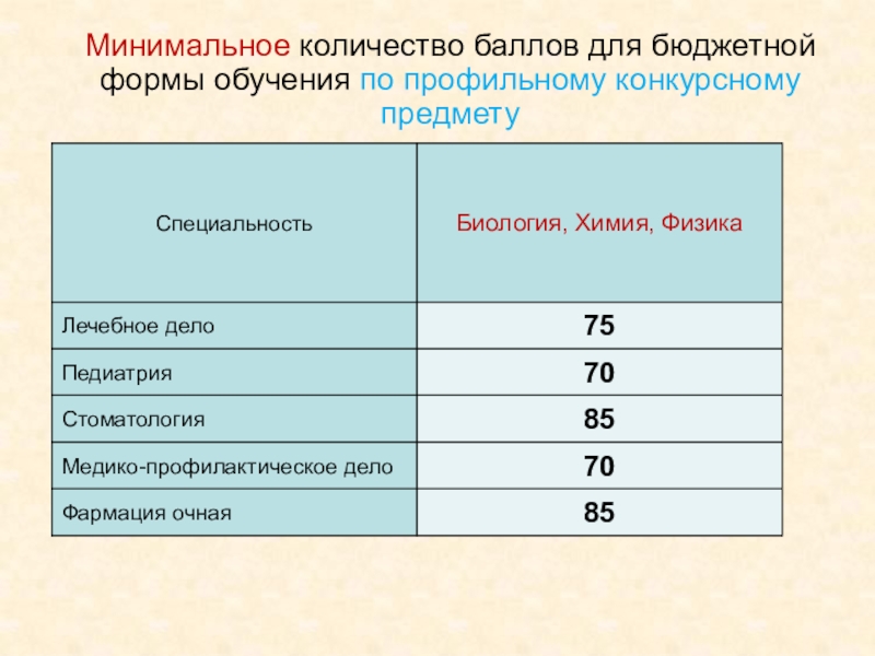 Слайд 13Минимальное количество баллов для бюджетной формы обучения по профильному конкурсному