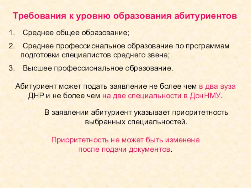 может подать заявление не более чем в два вуза ДНР и не более чем на две специальности в ДонНМУ.