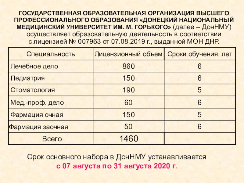 ИМ. М. ГОРЬКОГО» (далее – ДонНМУ) осуществляет образовательную деятельность в