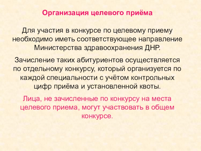 Лица, не зачисленные по конкурсу на места целевого приема, могут участвовать в общем конкурсе.