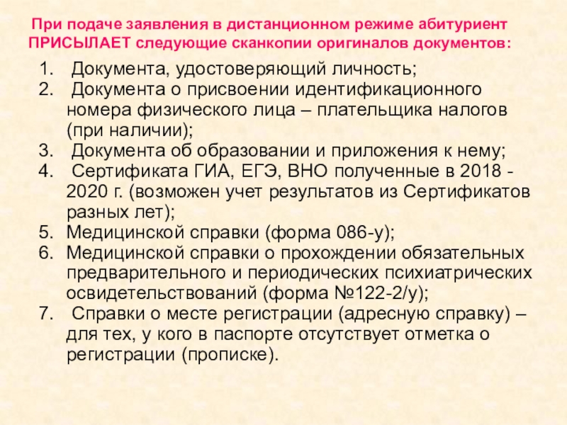 При подаче заявления в дистанционном режиме абитуриент ПРИСЫЛАЕТ следующие сканкопии оригиналов документов:
