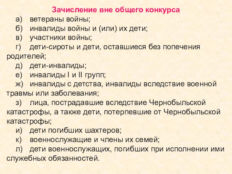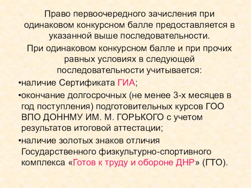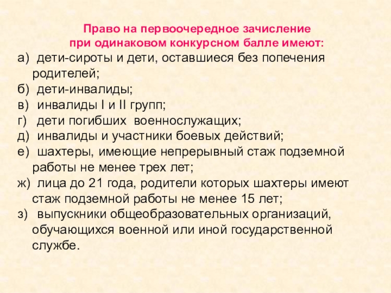 Слайд 24Право первоочередного зачисления при одинаковом конкурсном балле предоставляется в указанной