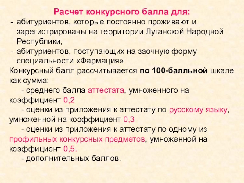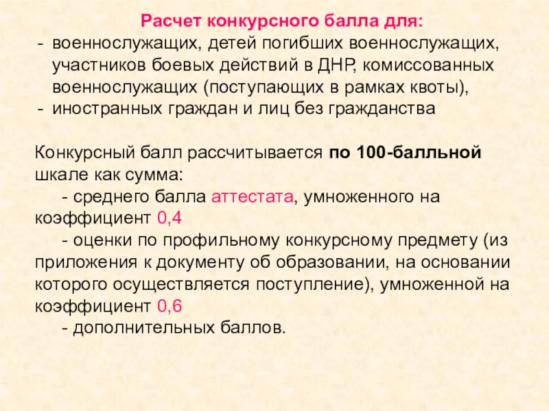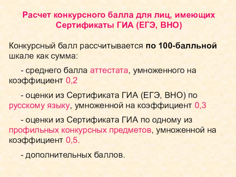 Слайд 15Расчет конкурсного балла для лиц, имеющих Сертификаты ГИА (ЕГЭ, ВНО)
