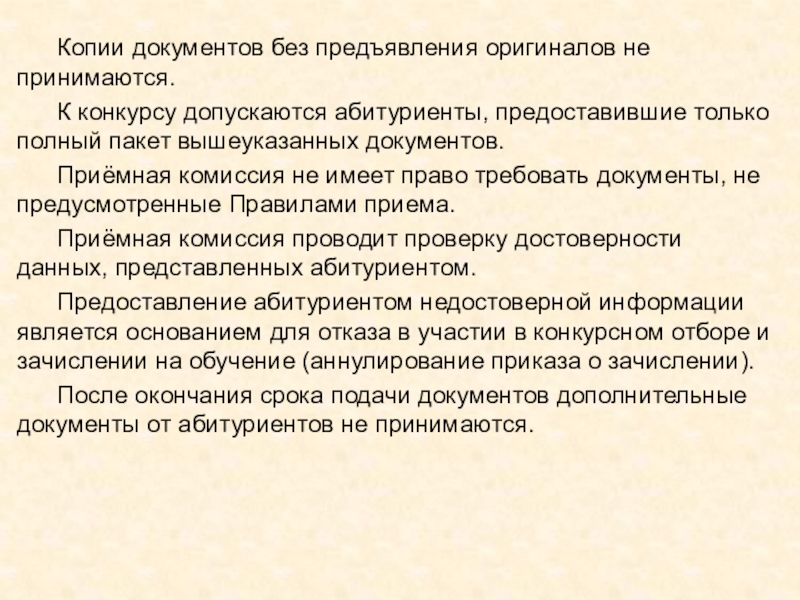 Слайд 11 Копии документов без предъявления оригиналов не принимаются.
