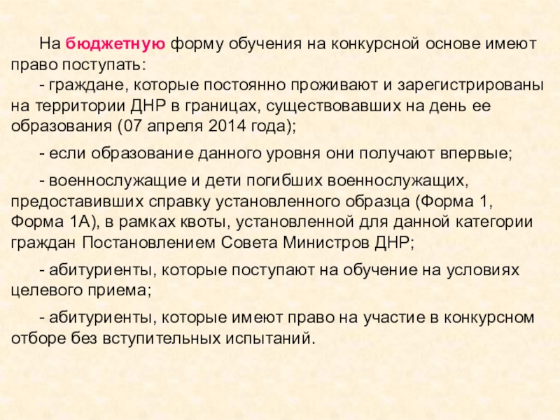 Слайд 4 На бюджетную форму обучения на конкурсной основе имеют право поступать: