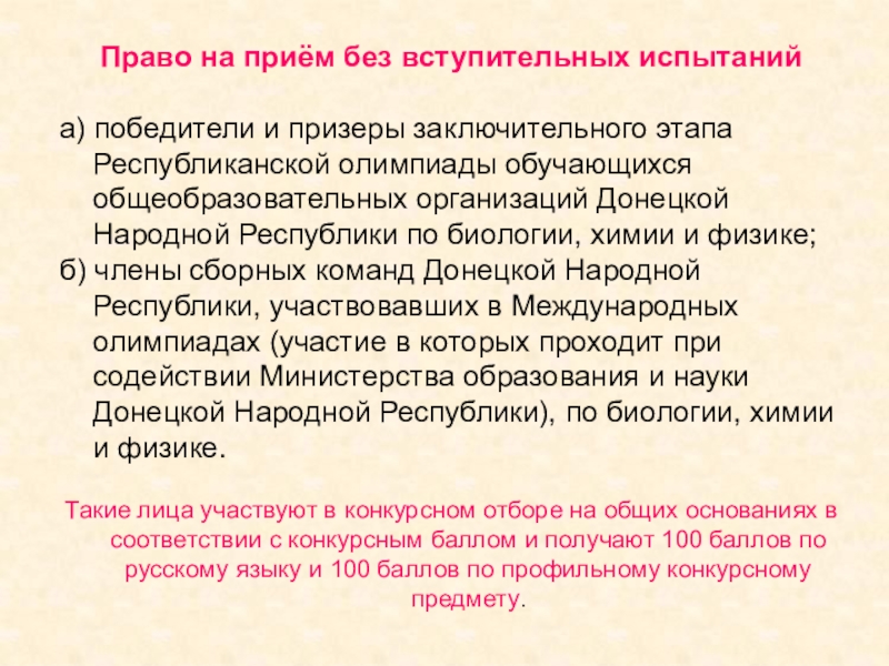 б) члены сборных команд Донецкой Народной Республики, участвовавших в Международных олимпиадах (участие в которых проходит при содействии Министерства образования и науки Донецкой Народной Республики), по биологии, химии и физике.