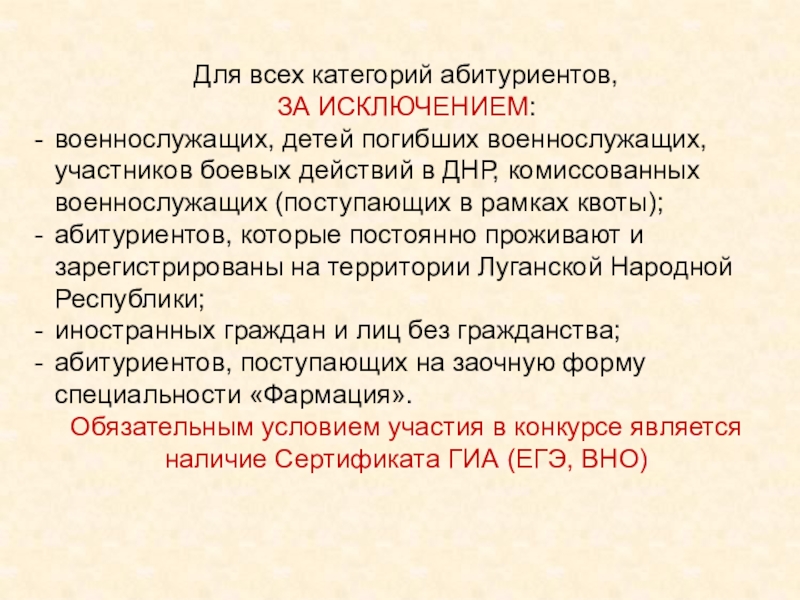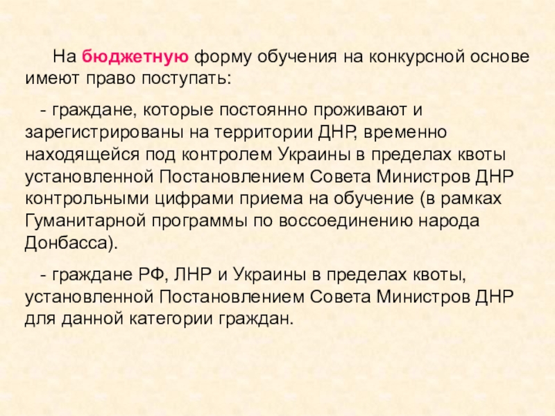 ДНР, временно находящейся под контролем Украины в пределах квоты установленной Постановлением Совета Министров ДНР контрольными цифрами приема на обучение (в рамках Гуманитарной программы по воссоединению народа Донбасса).