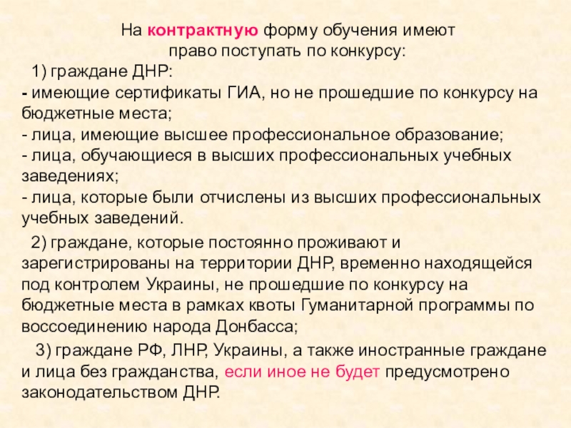 2) граждане, которые постоянно проживают и зарегистрированы на территории ДНР, временно находящейся под контролем Украины, не прошедшие по конкурсу на бюджетные места в рамках квоты Гуманитарной программы по воссоединению народа Донбасса;
