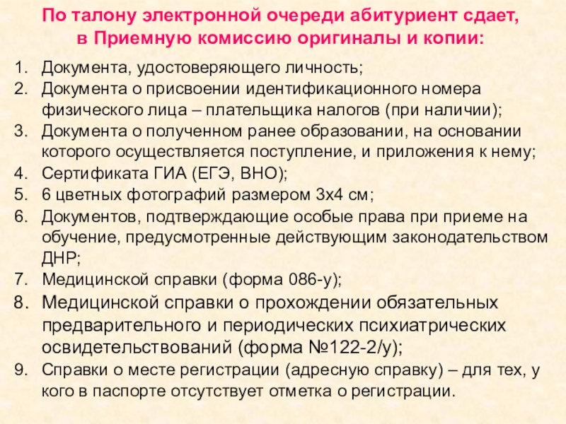 Слайд 10По талону электронной очереди абитуриент сдает,