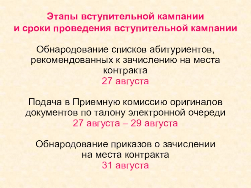 Слайд 26Этапы вступительной кампании и сроки проведения вступительной кампании