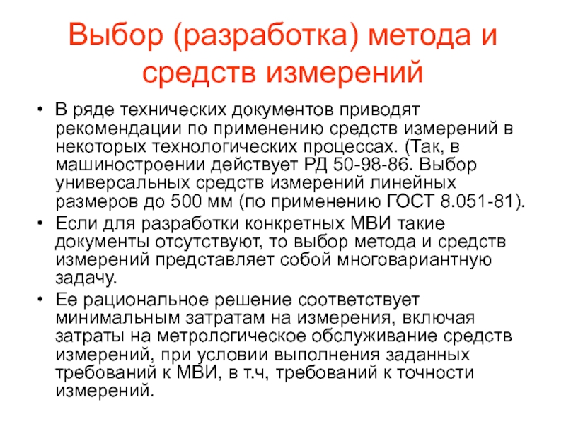 Если для разработки конкретных МВИ такие документы отсутствуют, то выбор метода и средств измерений представляет собой многовариантную задачу.