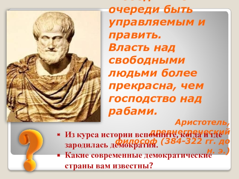 древнегреческий философ (384-322 гг. до н. э.)Из курса истории вспомните, когда и где зародилась демократия.