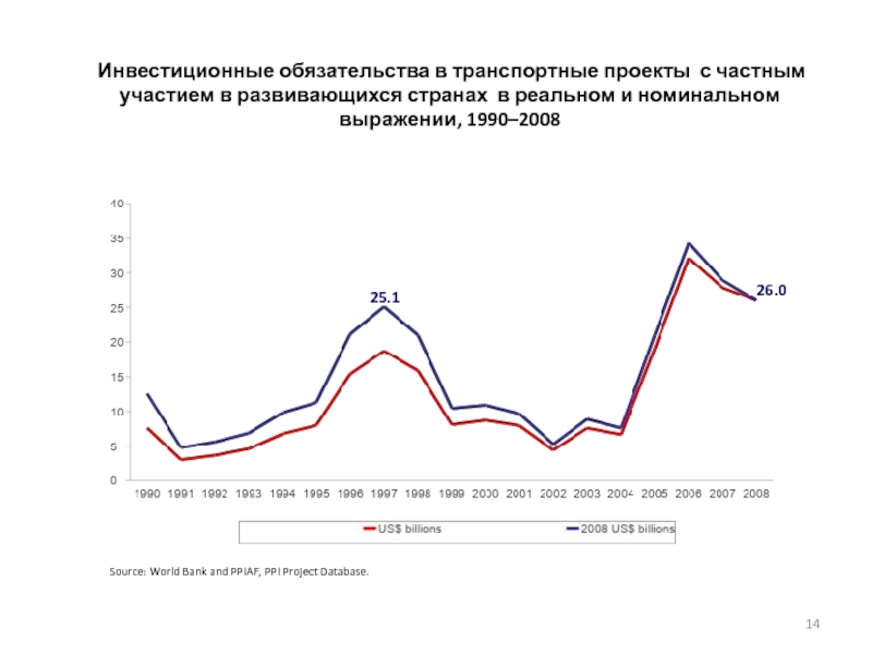 Слайд 14Инвестиционные обязательства в транспортные проекты с частным участием в развивающихся