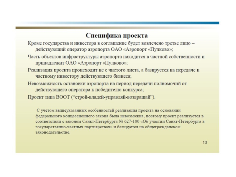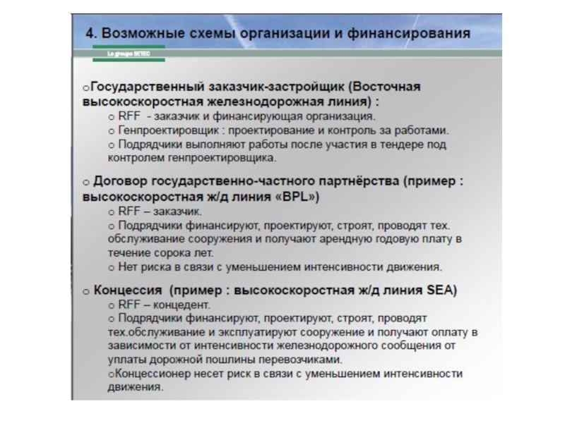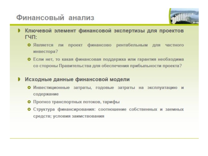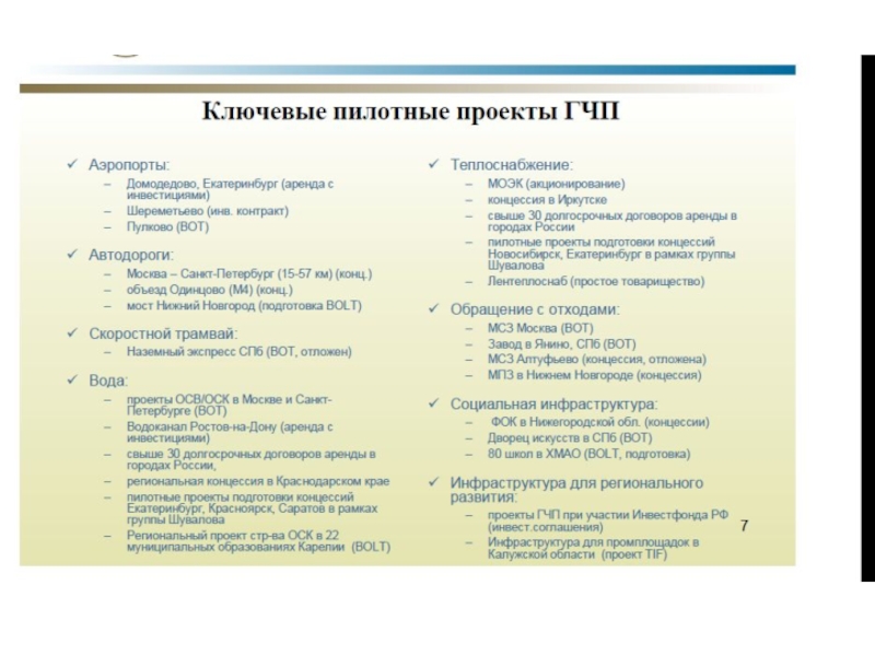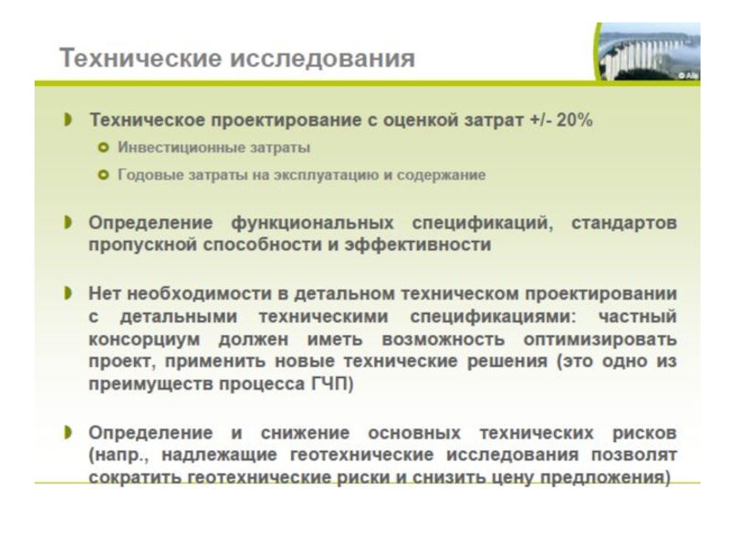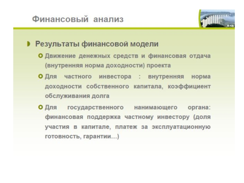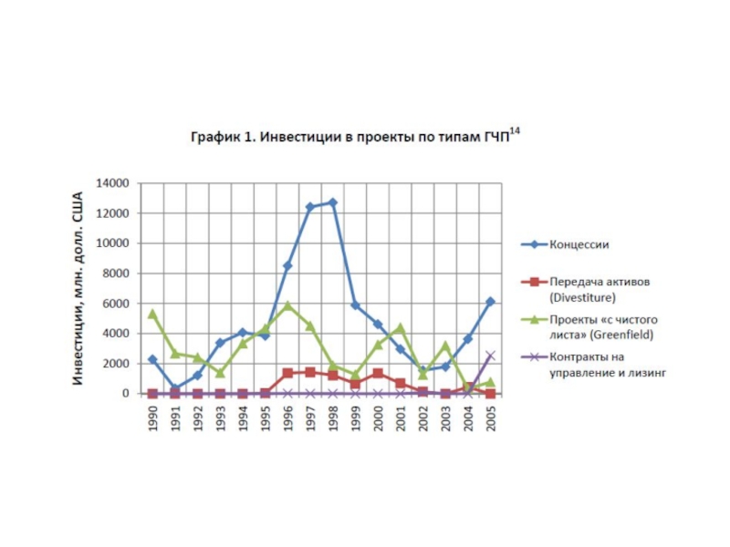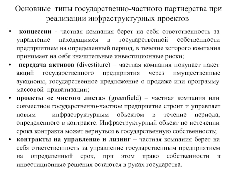 проекты «с чистого листа» (greenfield) – частная компания или совместное государственно-частное предприятие строит и управляет новым инфраструктурным объектом в течение периода, определенного в контракте. Инфраструктурный объект по истечении срока контракта может вернуться в государственную собственность;