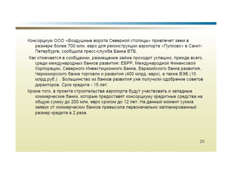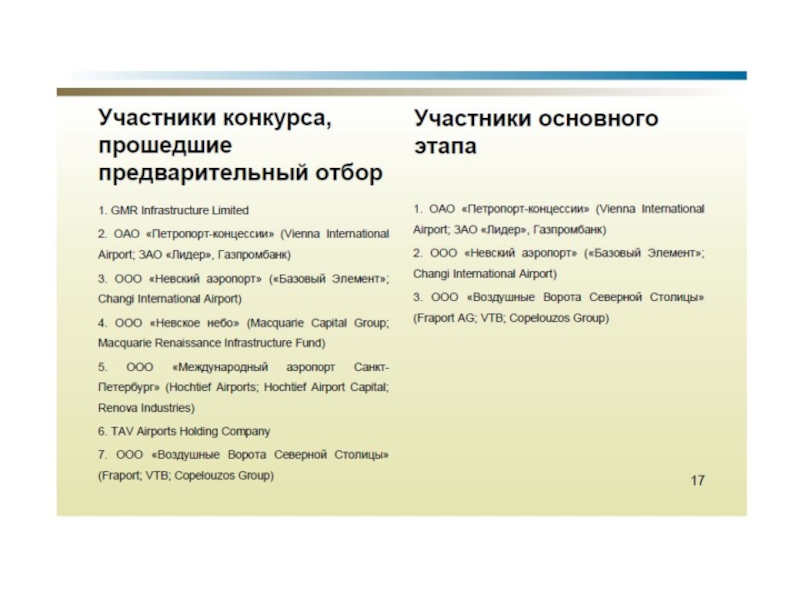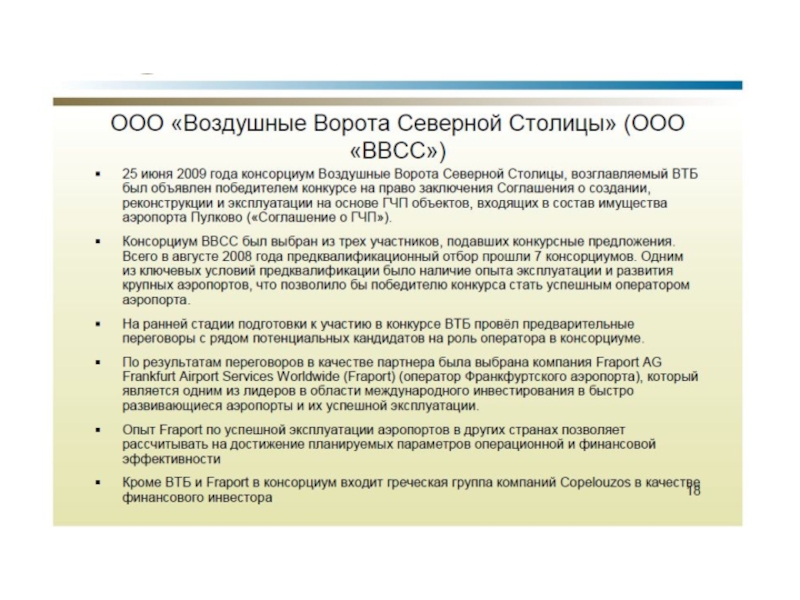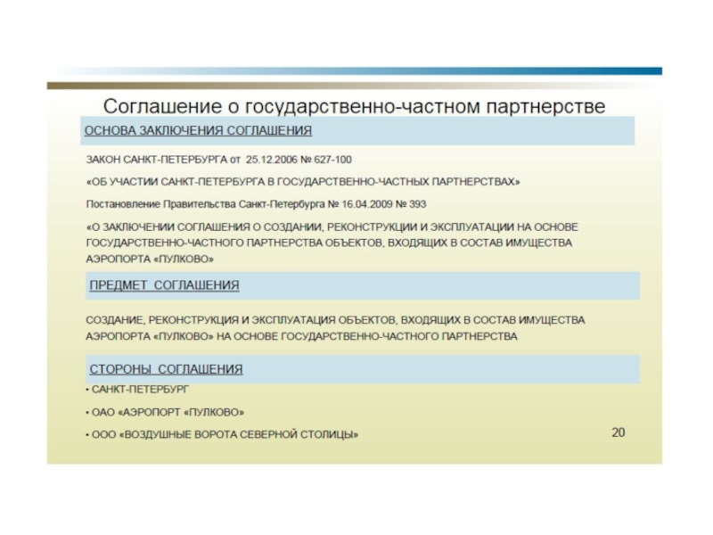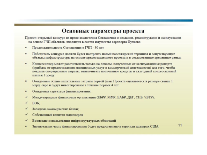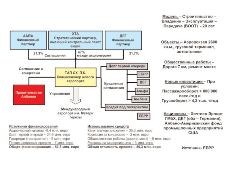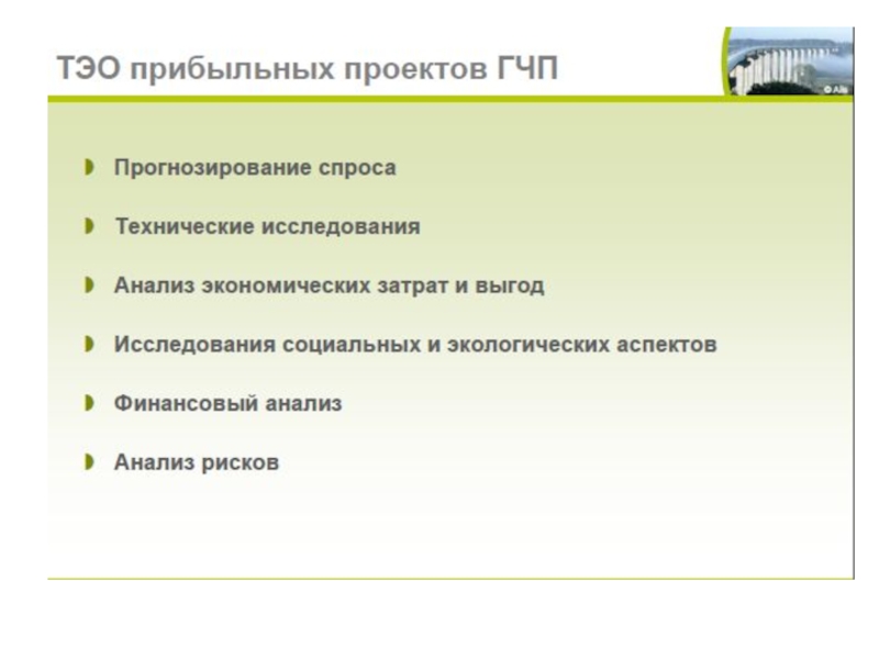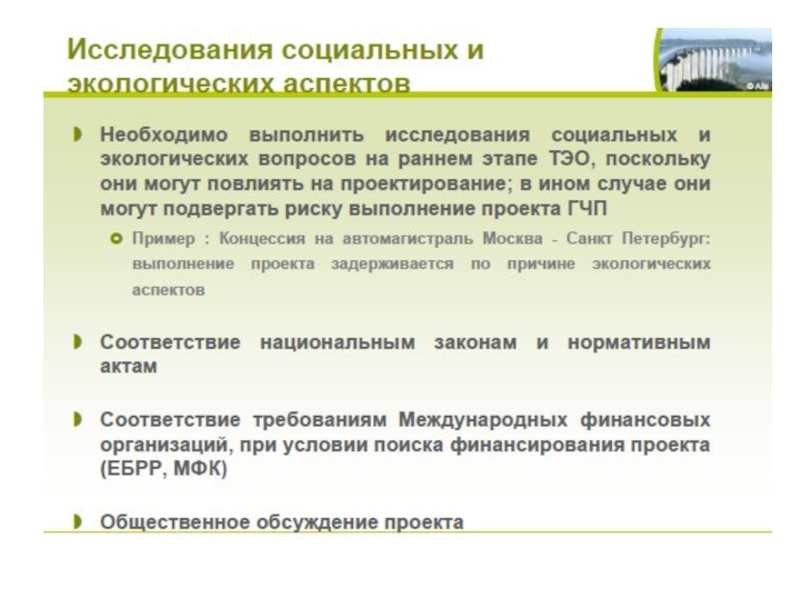 проекты «с чистого листа» (greenfield) – частная компания или совместное государственно-частное предприятие строит и управляет новым инфраструктурным объектом в течение периода, определенного в контракте. Инфраструктурный объект по истечении срока контракта может вернуться в государственную собственность;