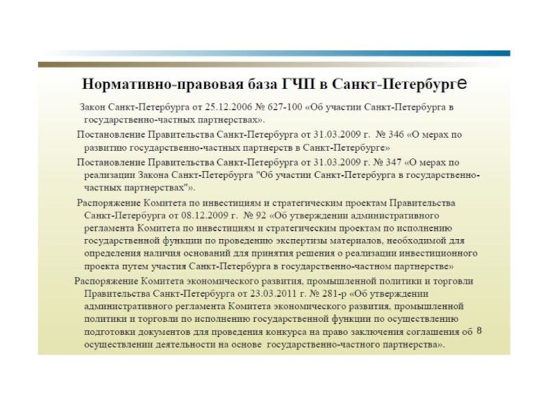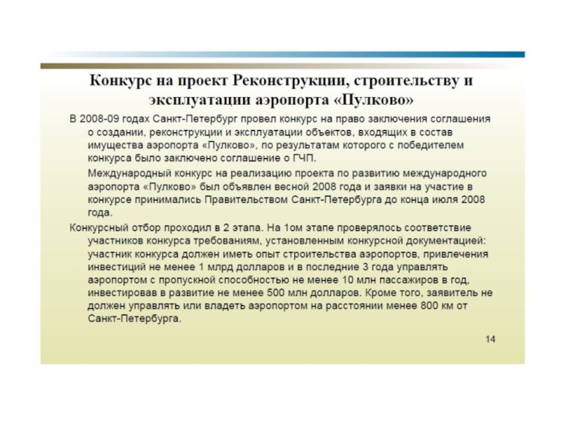 транспорте, а следовательно, и государственных инвестиционных ресурсов, аккумулированных на основе налоговых поступлений. Это предполагает непреложность сохранения традиционного подхода к институту партнерства и развитие системы государственных контрактов, размещаемых на конкурсной основе. Императив конкурсности представляет четвертую особенность института ГЧП.