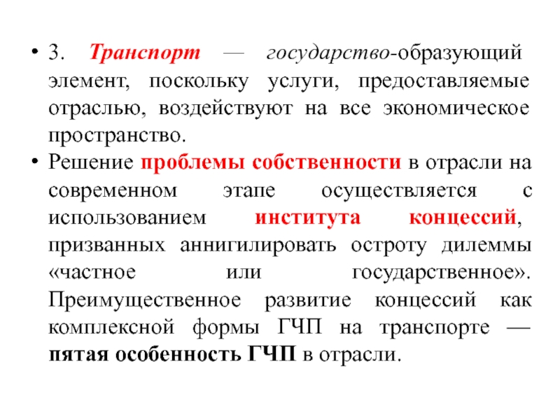 современном этапе осуществляется с использованием института концессий, призванных аннигилировать остроту дилеммы «частное или государственное». Преимущественное развитие концессий как комплексной формы ГЧП на транспорте — пятая особенность ГЧП в отрасли.