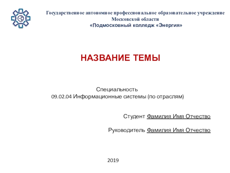 Государственное автономное профессиональное образовательное учреждение Московской области «Подмосковный колледж «Энергия»Название темыСтудент Фамилия Имя ОтчествоРуководитель Фамилия Имя Отчество2019Специальность